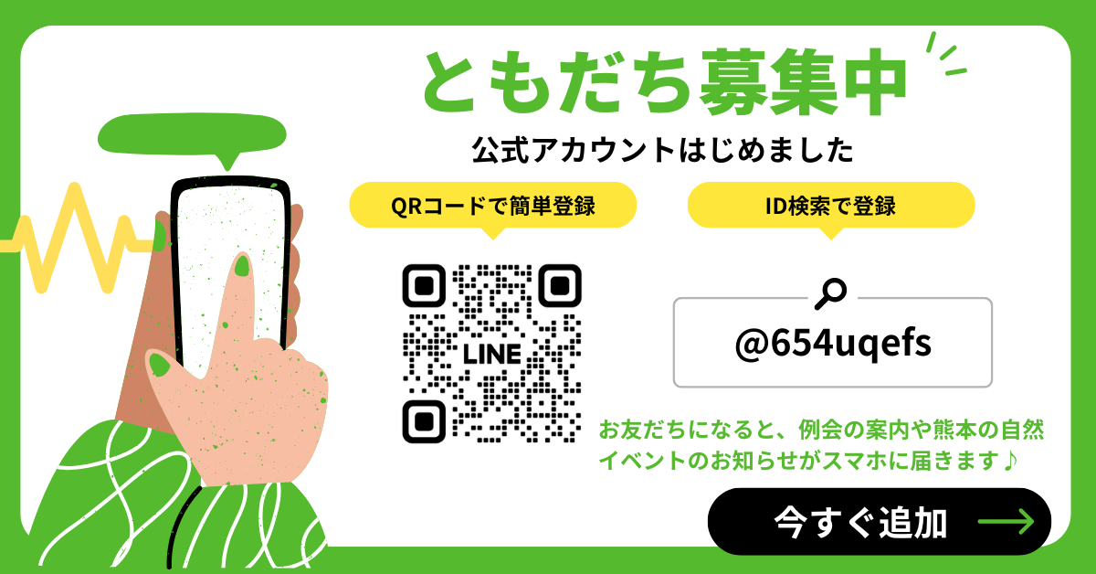 立田山自然探検隊への入会をご検討中の方へ お知らせ 2025.10.18 入会をご希望の方は、下記のLINE公式アカウントを友だち追加してください✨メニュー内の「会員申込み」から、会員登録フォームにお進みいただけます。 入会手続は、初回参加の例会当日に、受付にて入会書類の記入および年会費のお支払い手続きにより完了となります。 ご入会時に必要な物は以下の通りです。◆年会費 個人会費 年間2,000円(ひとりで入会の方、どなたでも) 家族会員 年間3,000円(同住所のご家族なら何人でもOK) 自然の中での発見を、いっしょに楽しみましょう!